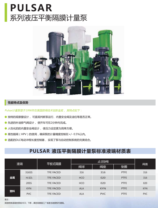 PULSAR系列液壓平衡隔膜計量泵55HL性能特點: