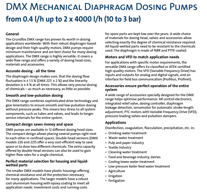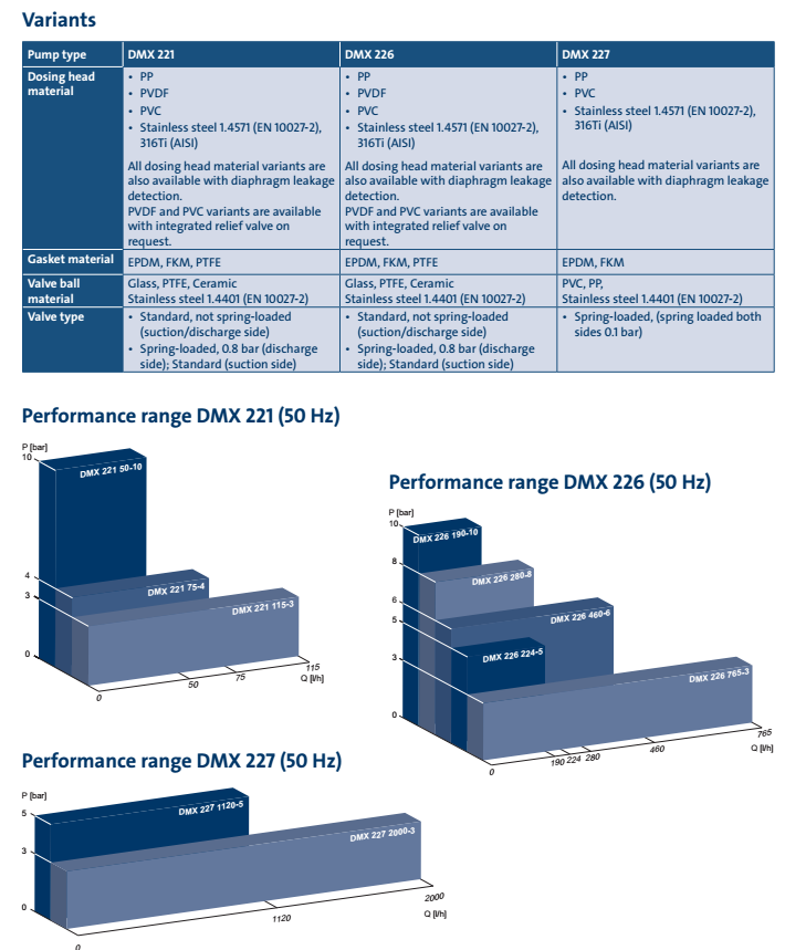 較小的DMX型號(hào)采用塑料外殼,具有耐化學(xué)性,為眾多應(yīng)用提供必要的保護(hù)。 較大的型號(hào)擁有耐用的鑄鋁外殼和樹(shù)脂涂層,符合各種應(yīng)用需求。 長(zhǎng)年保持低投資成本和低運(yùn)營(yíng)成本。 多種配量頭材料、閥門和配件可以準(zhǔn)確選擇所需耐化學(xué)性的程度。 所有液體濕潤(rùn)部件都需要對(duì)所使用的化學(xué)品有耐藥性。 膜片使用NBR制造和PTFE涂層。