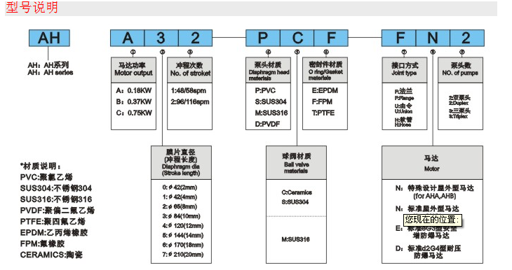 泵頭材質(zhì):PVC、SUS304/SUS316、PTFE,膜片為:PTFE/EPDM
