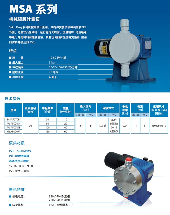 MSA系列泵是一種機械隔膜計量泵,具有彈簧復(fù)位機械裝置和PPS外殼,內(nèi)置雙凸輪機構(gòu),運行穩(wěn)定無噪音,流量精準。