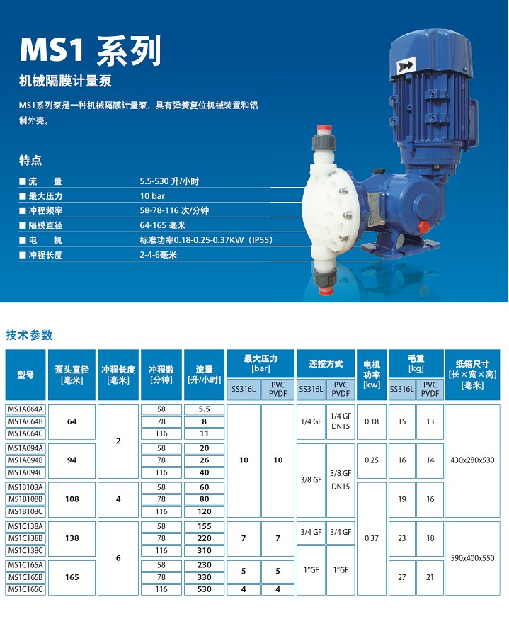 SEKO機(jī)械隔膜計(jì)量泵MS系列分為MS1、MS3、MS4三個(gè)系列 機(jī)械隔膜計(jì)量泵型號(hào) 最大流量 最大壓力 隔膜計(jì)量泵描述 MS1A064A 5.5L/H 10BAR SEKO機(jī)械隔膜計(jì)量泵 MS1A064B 8L/H SEKO機(jī)械隔膜計(jì)量泵 MS1A064C 11L/H SEKO機(jī)械隔膜計(jì)量泵 MS1A094A 20L/H SEKO機(jī)械隔膜計(jì)量泵 MS1A094B 26L/H SEKO機(jī)械隔膜計(jì)量泵 MS1A094C 40L/H SEKO機(jī)械隔膜計(jì)量泵 MS1B108A 60L/H SEKO機(jī)械隔膜計(jì)量泵 MS1B108B 80L/H SEKO機(jī)械隔膜計(jì)量泵 MS1B108C 120L/H SEKO機(jī)械隔膜計(jì)量泵 MS1C138A 155L/H 7BAR SEKO機(jī)械隔膜計(jì)量泵 MS1C138B 220L/H SEKO機(jī)械隔膜計(jì)量泵 MS1C138C 310L/H SEKO機(jī)械隔膜計(jì)量泵 MS1C165A 230L/H 5BAR SEKO機(jī)械隔膜計(jì)量泵 MS1C165B 330L/H SEKO機(jī)械隔膜計(jì)量泵 MS1C165C 530L/H 4BAR SEKO機(jī)械隔膜計(jì)量泵 MS3C165H 660L/H SEKO機(jī)械隔膜計(jì)量泵MS3系列 MS4H210L 800L/H SEKO機(jī)械隔膜計(jì)量泵MS4系列 MS4H210C 1000L/H SEKO機(jī)械隔膜計(jì)量泵MS4系列